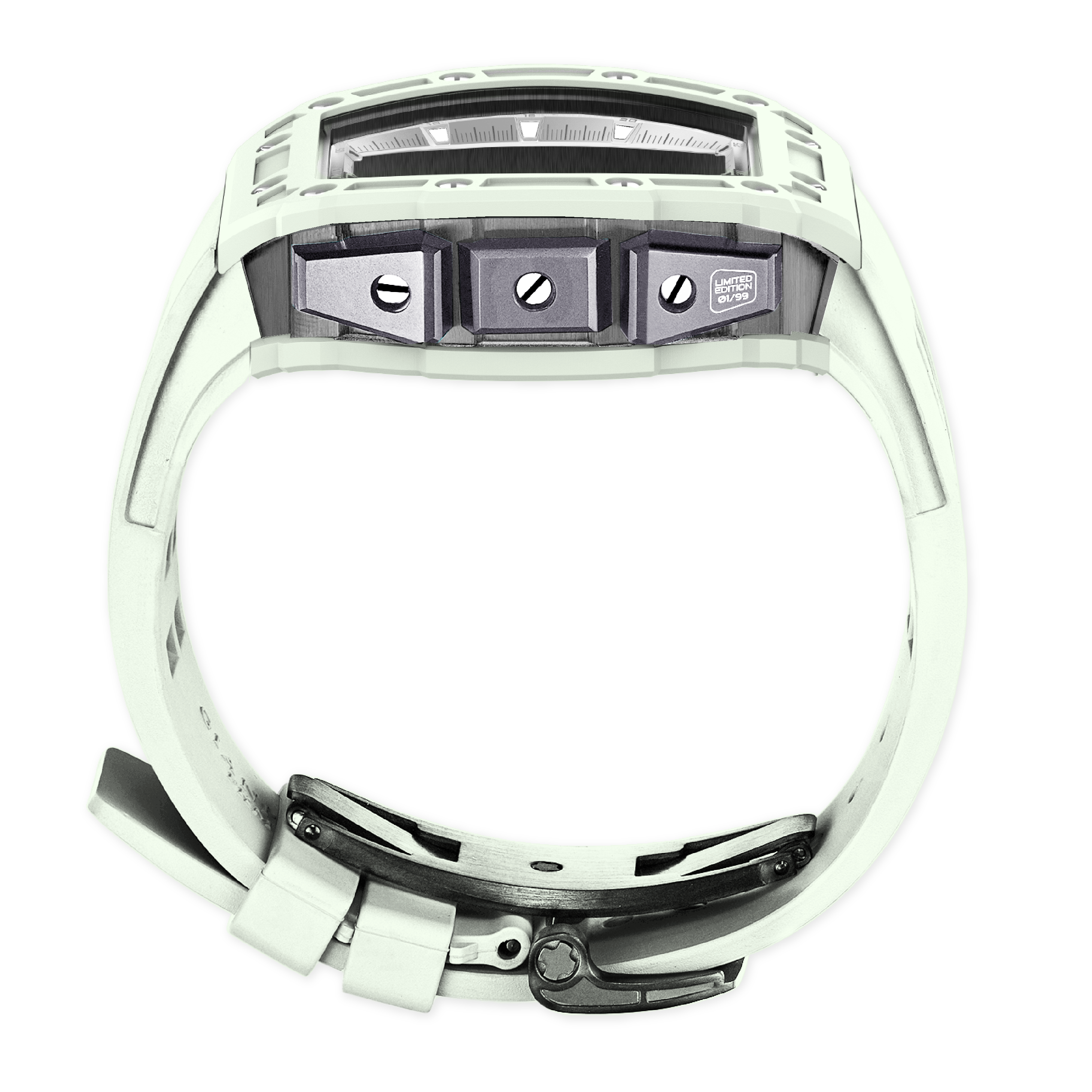 防反射藍寶石水晶錶帶和表扣:矽膠錶帶,316L 不銹鋼,三重折疊表扣,IP 啞光電鍍。錶盤和指針:發光手錶錶盤索引和發光手錶指針。每個獨立編號全球限量 99 件。