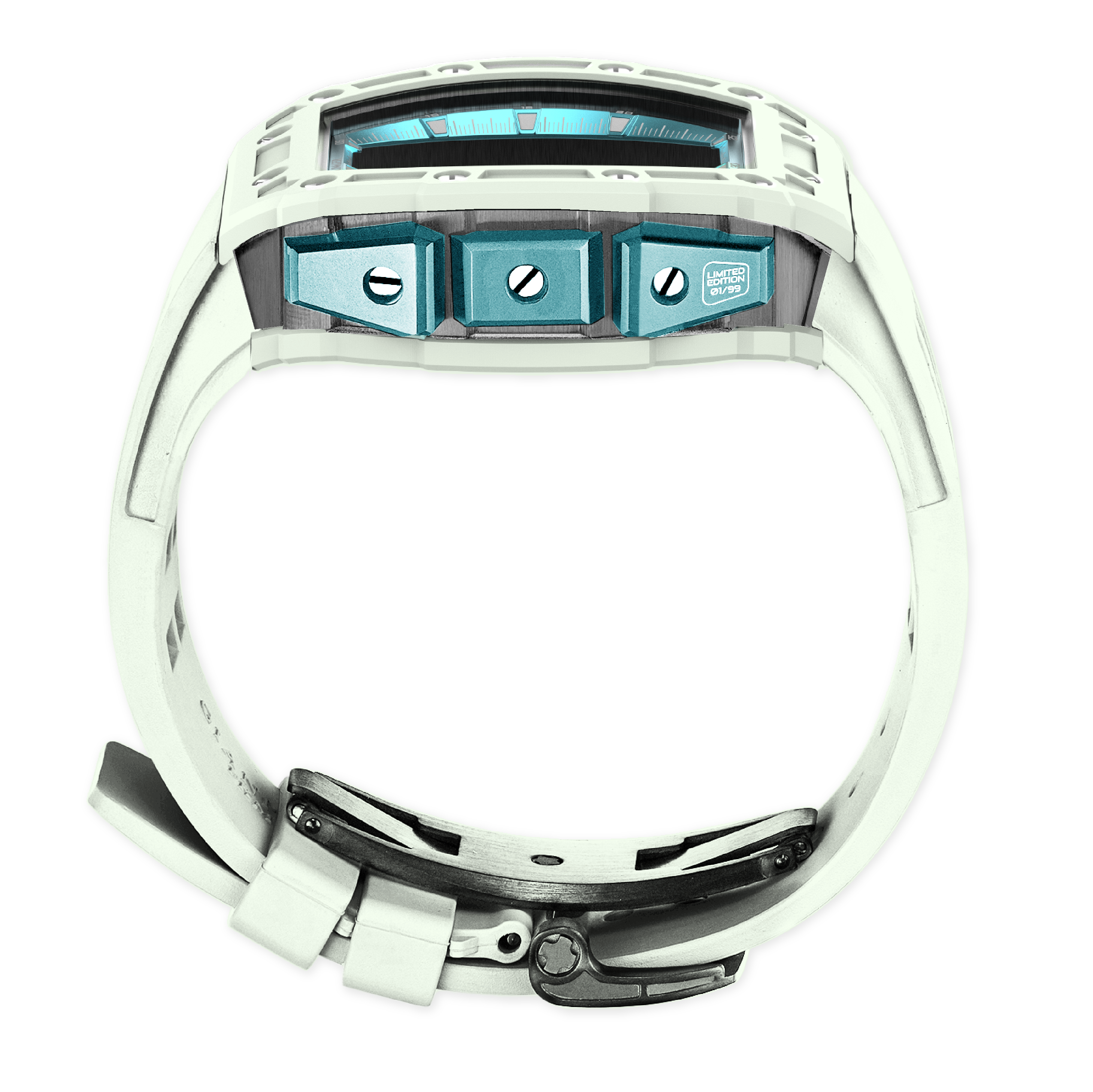 防反射藍寶石水晶錶帶和表扣:矽膠錶帶,316L 不銹鋼,三重折疊表扣,IP 啞光電鍍。錶盤和指針:發光手錶錶盤索引和發光手錶指針。每個獨立編號全球限量 99 件。
