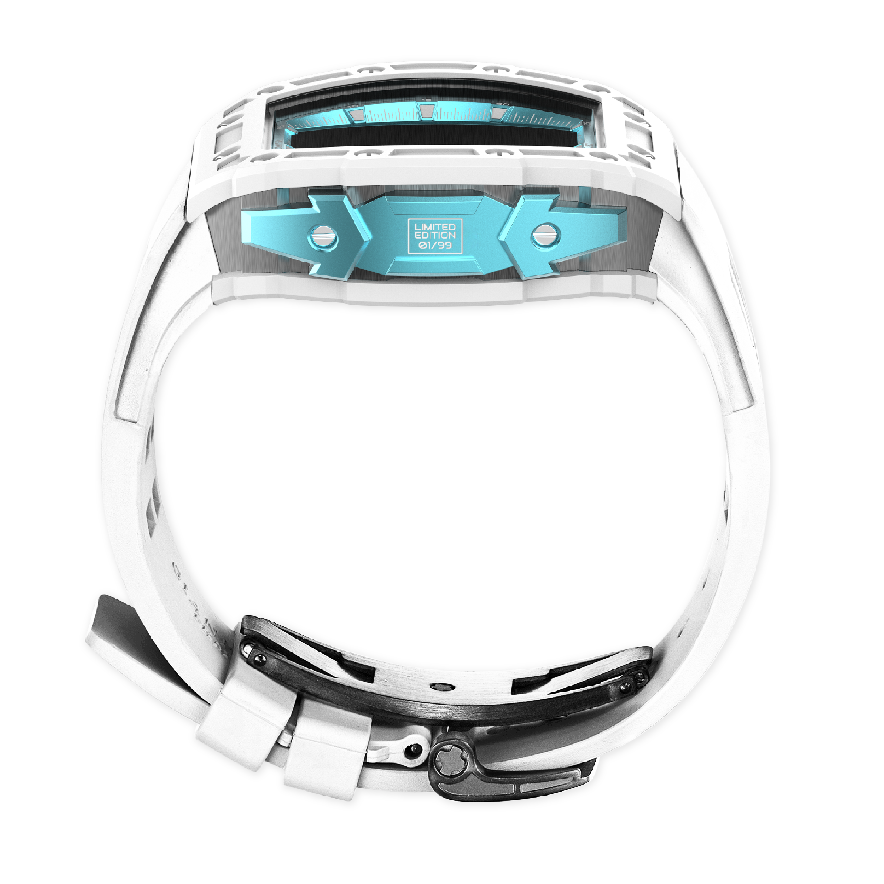 錶帶和表扣:矽膠錶帶搭配 316L 不銹鋼蝴蝶設計表扣,IP 黑色啞光電鍍。