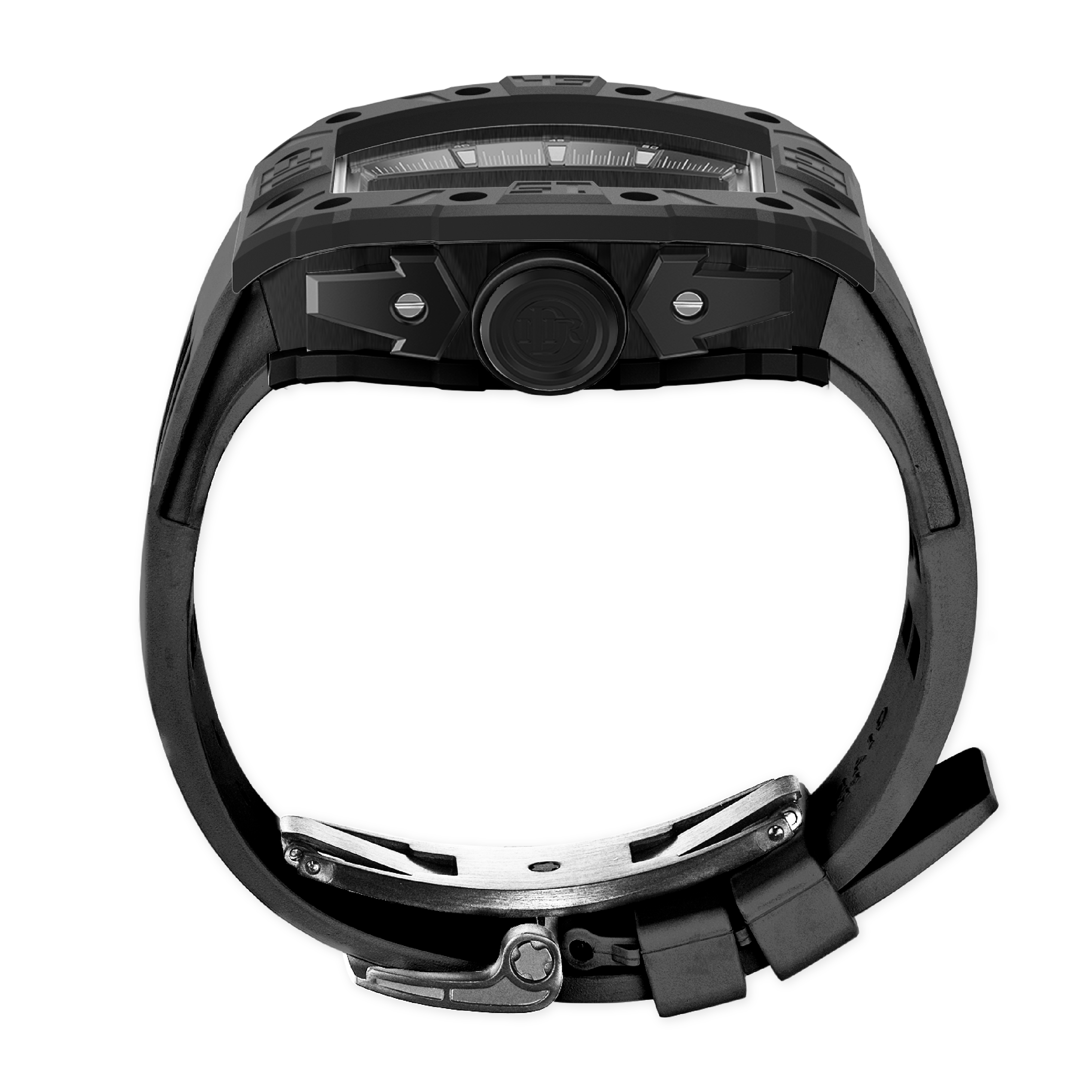錶帶和表扣:矽膠錶帶搭配 316L 不銹鋼蝴蝶設計表扣,IP 黑色啞光電鍍。