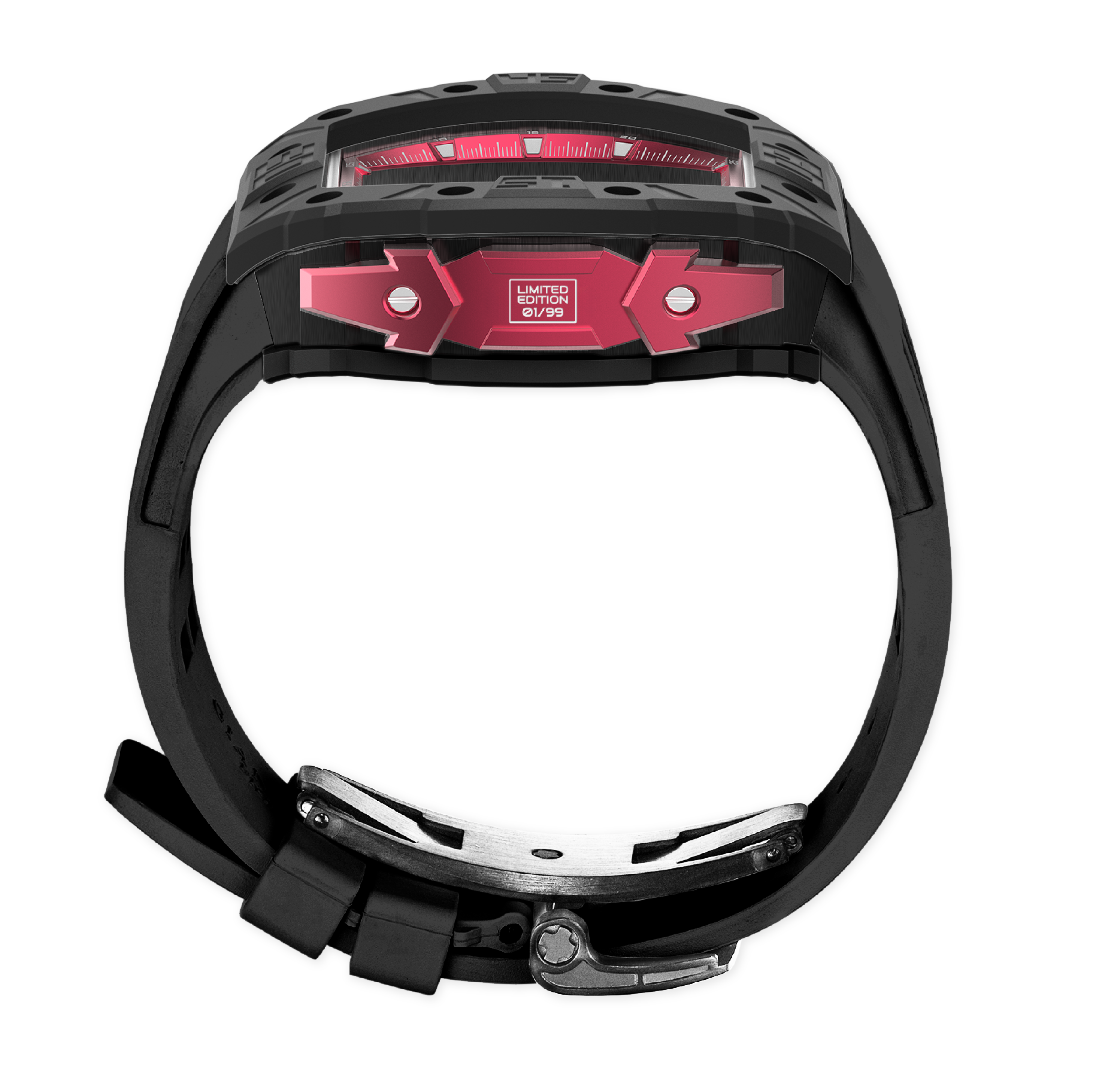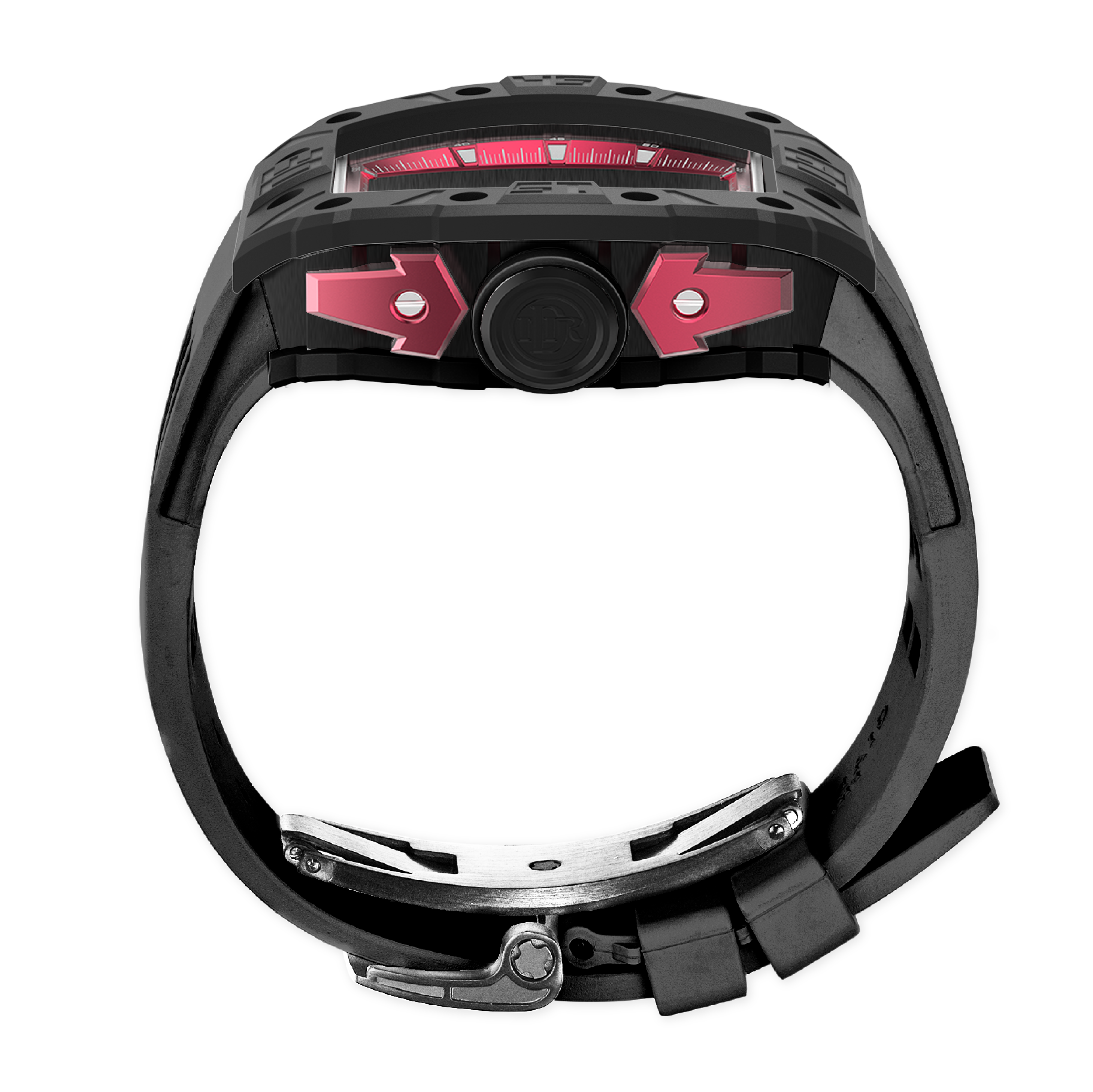 錶帶和表扣:矽膠錶帶搭配 316L 不銹鋼蝴蝶設計表扣,IP 黑色啞光電鍍。