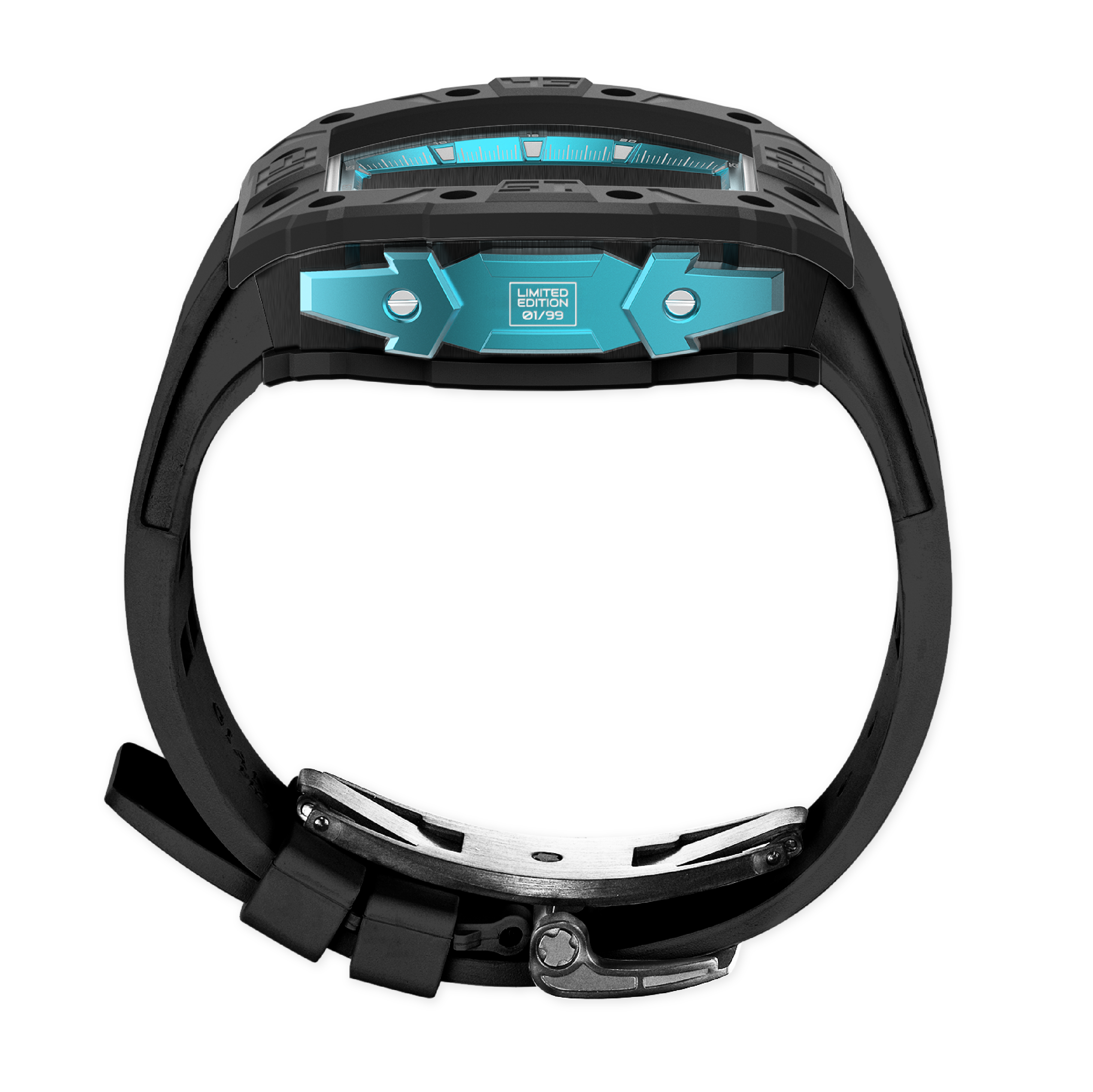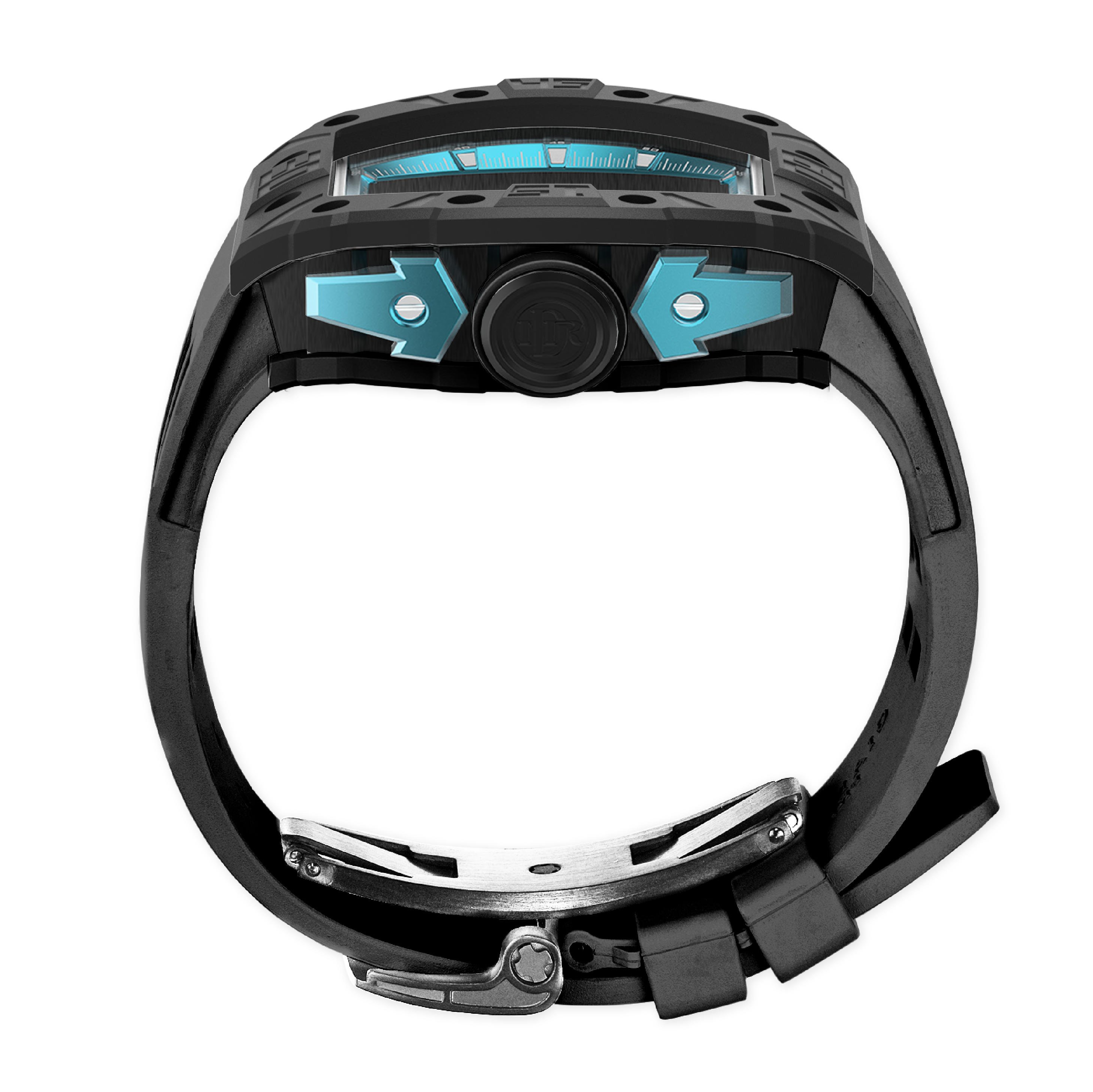 錶帶和表扣:矽膠錶帶搭配 316L 不銹鋼蝴蝶設計表扣,IP 黑色啞光電鍍。