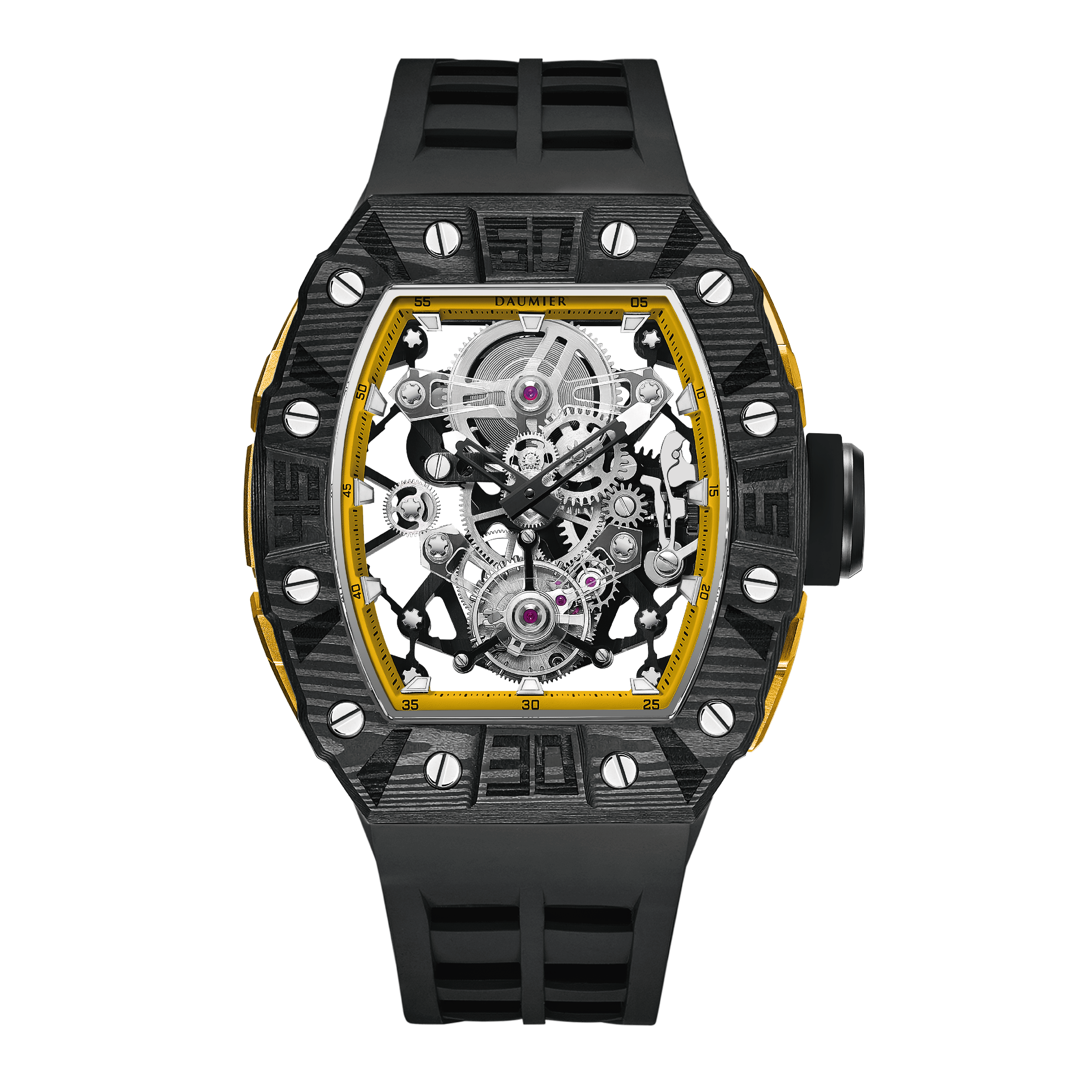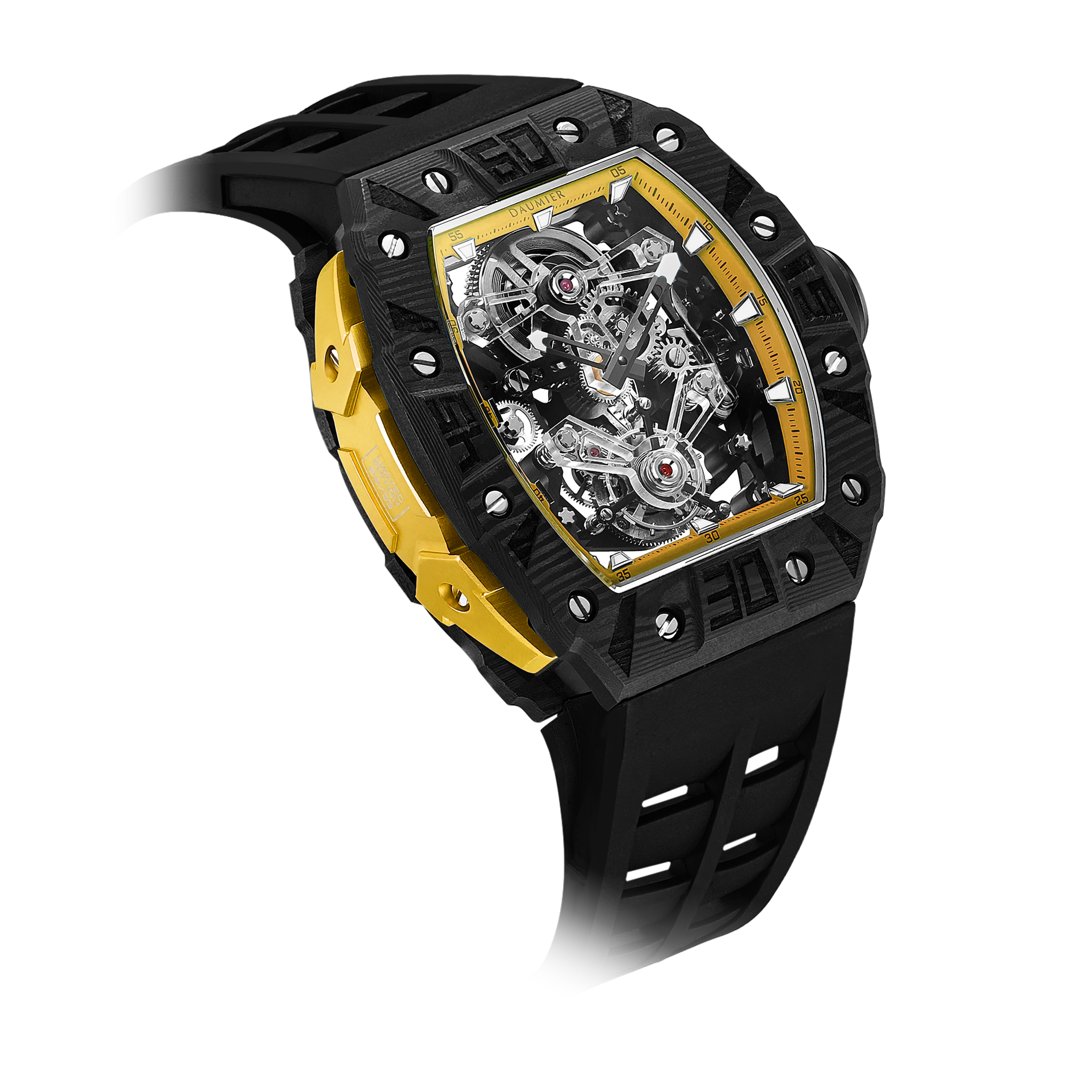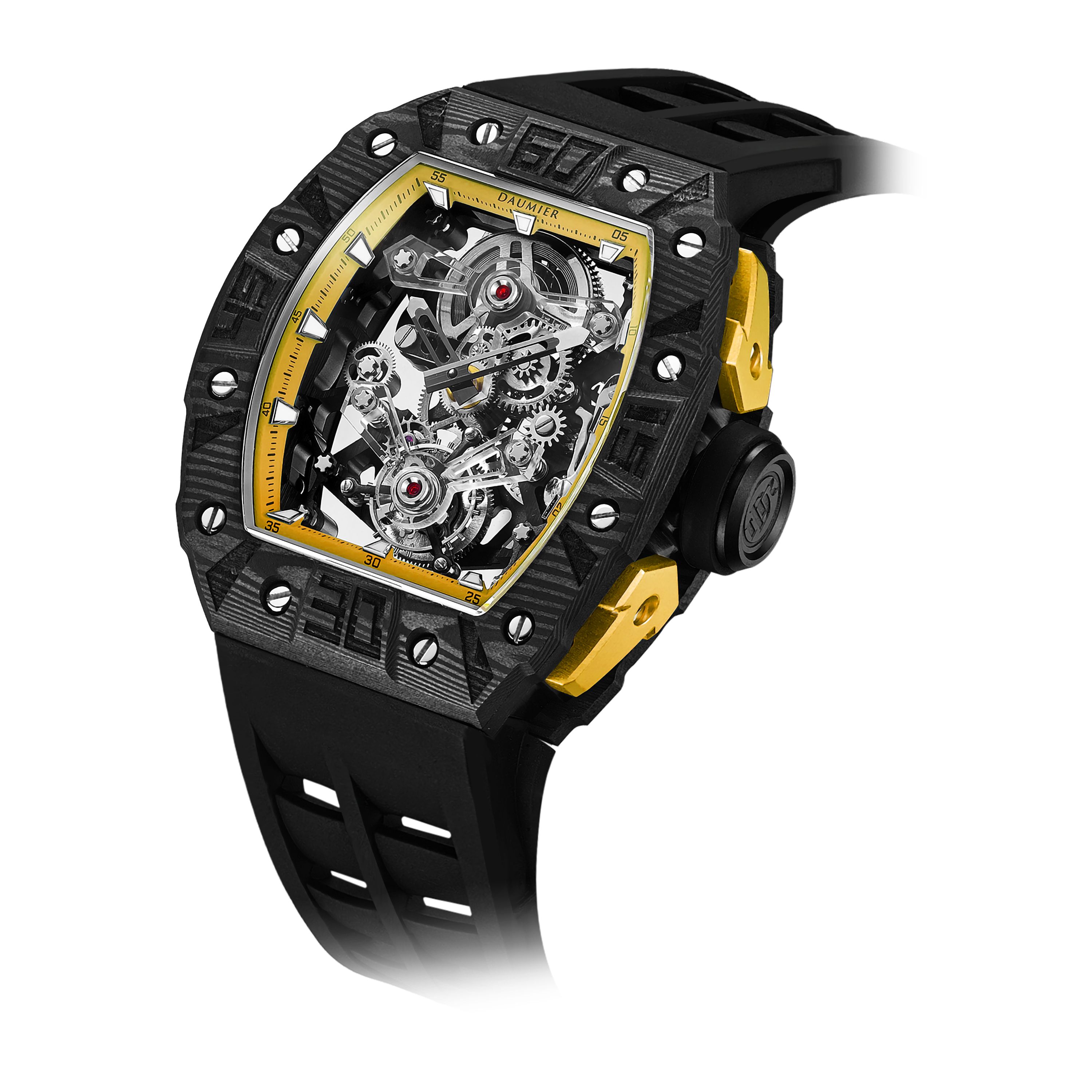 Daumier獨家設計的碳纖維表圈和底蓋碳纖維表圈均採用日本進口TORAYCA碳纖維原材。碳纖維表圈超級夜光功能,用於指定型號。