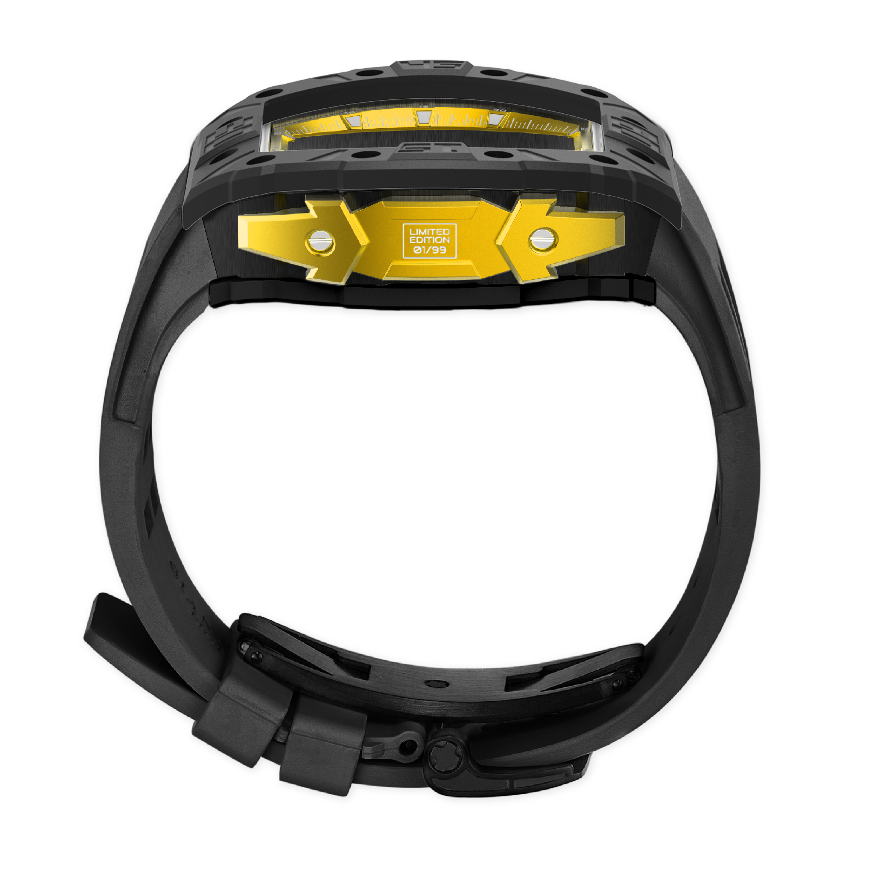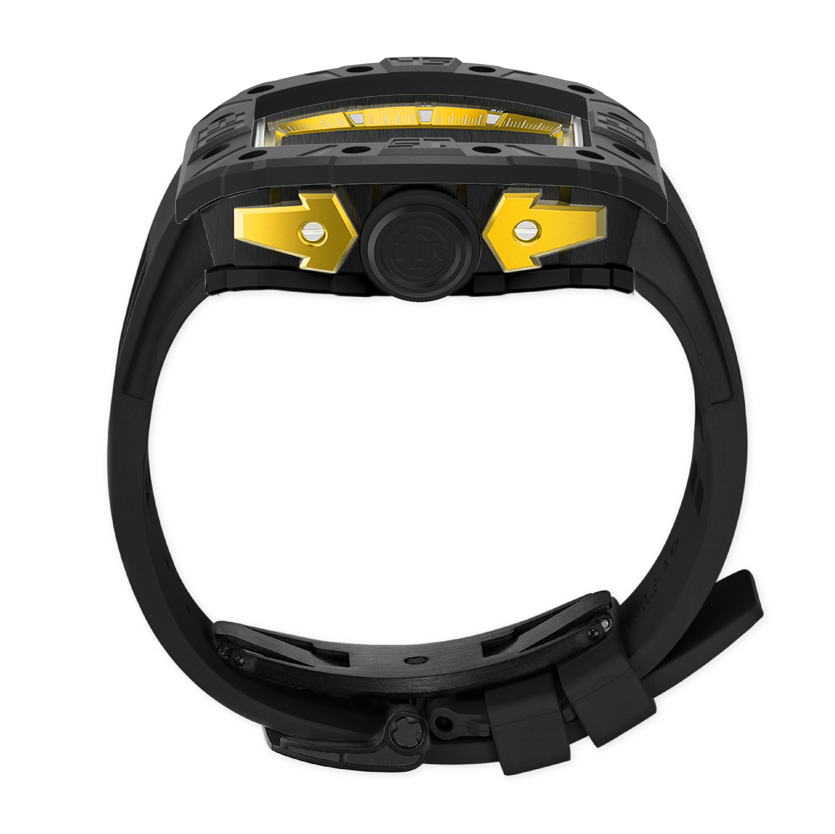 錶帶和表扣:矽膠錶帶搭配 316L 不銹鋼蝴蝶設計表扣,IP 黑色啞光電鍍。