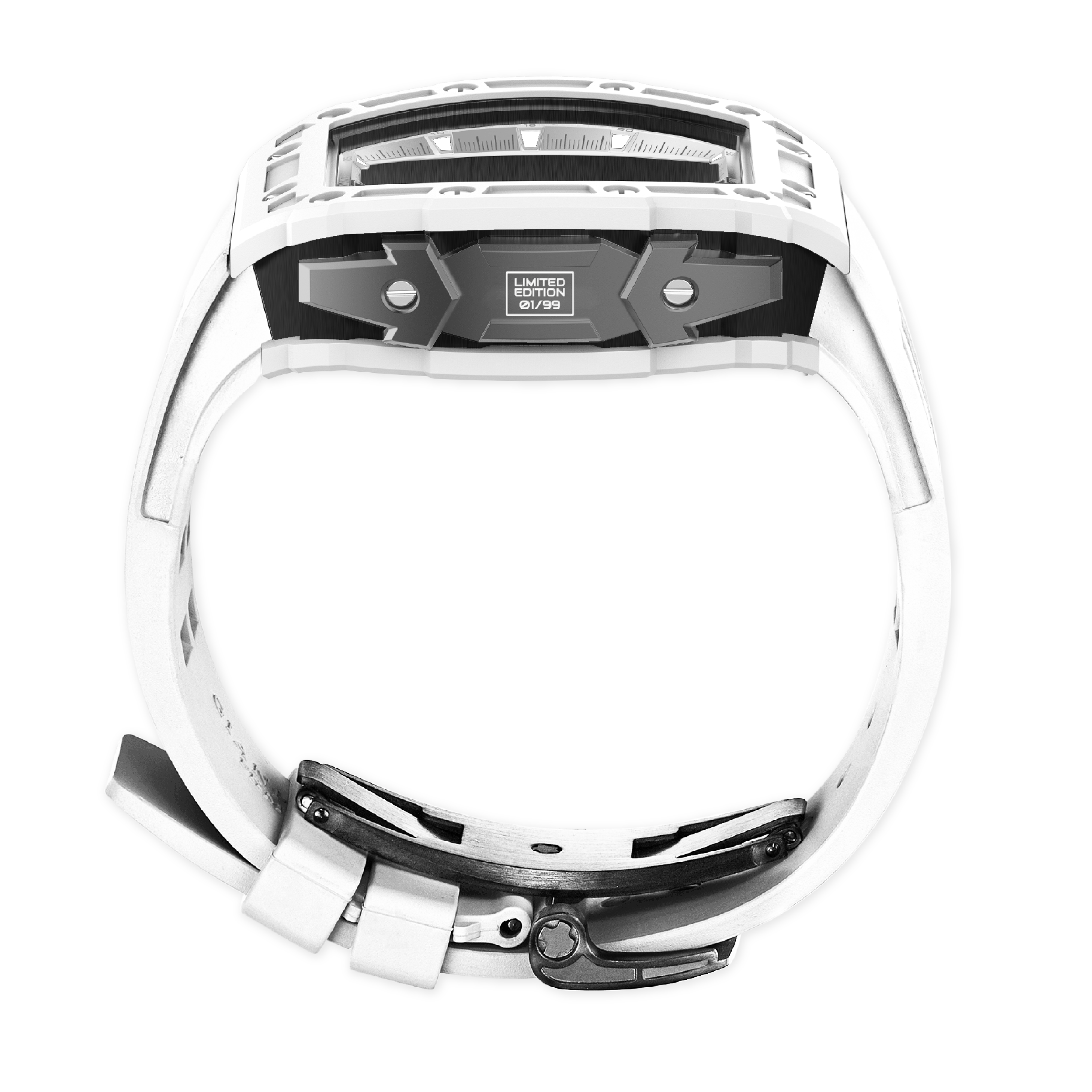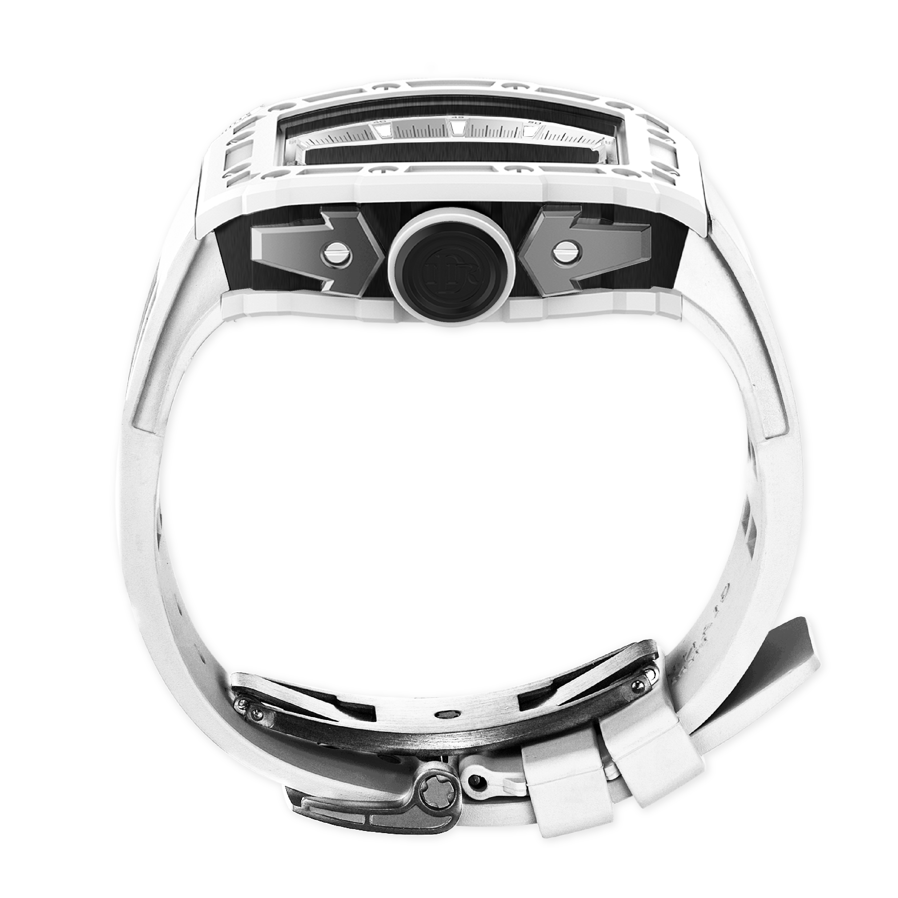 錶帶和表扣:矽膠錶帶搭配 316L 不銹鋼蝴蝶設計表扣,IP 黑色啞光電鍍。